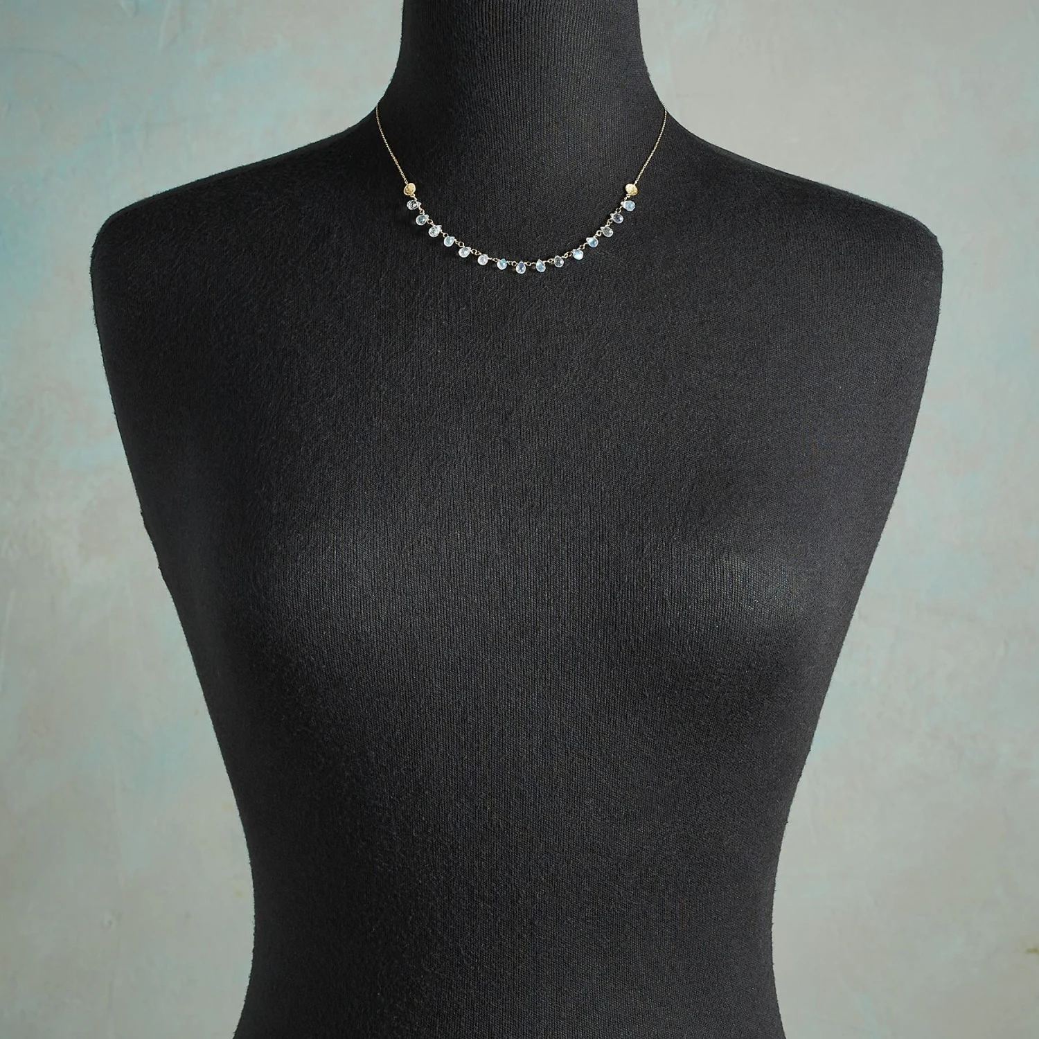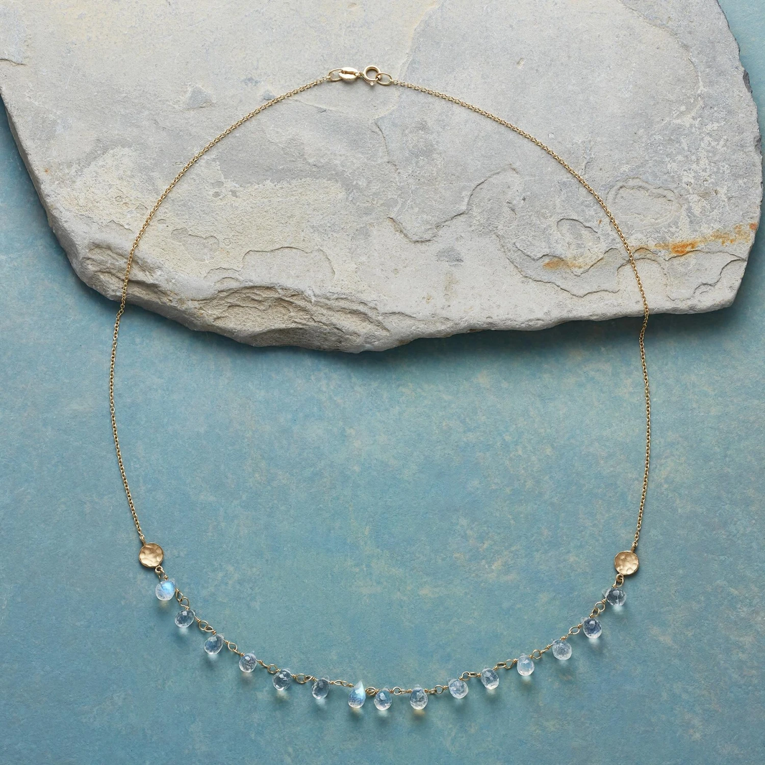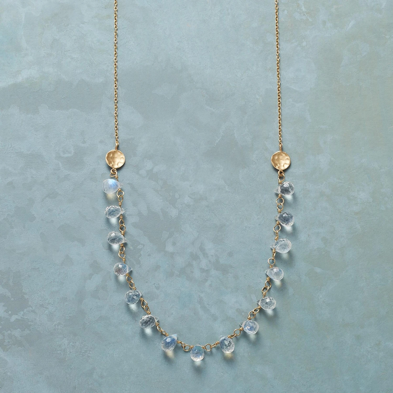 Lavishly faceted moonstone briolettes cast an arc of moonlight between hammered disks, a delicate display on 14kt gold links. Handmade in Canada by Anne Sportun. Spring ring clasp. 17″L.