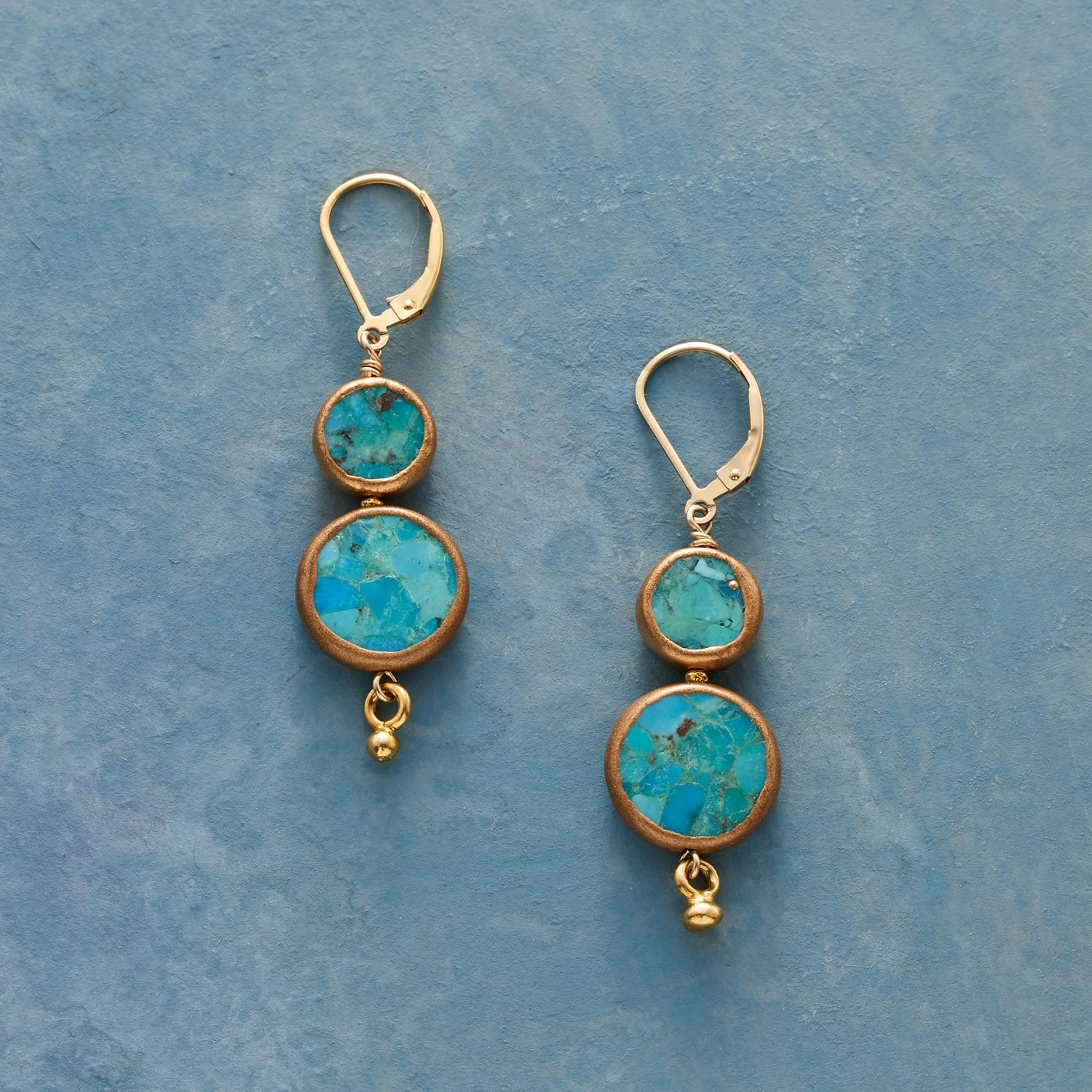 Warm and cool collide in dynamic disks of stabilized turquoise, wrapped in copper and paired with 22kt gold plated Thai silver drops. 14kt gold filled lever-back wires. Handcrafted in USA. Exclusive. 2″L.