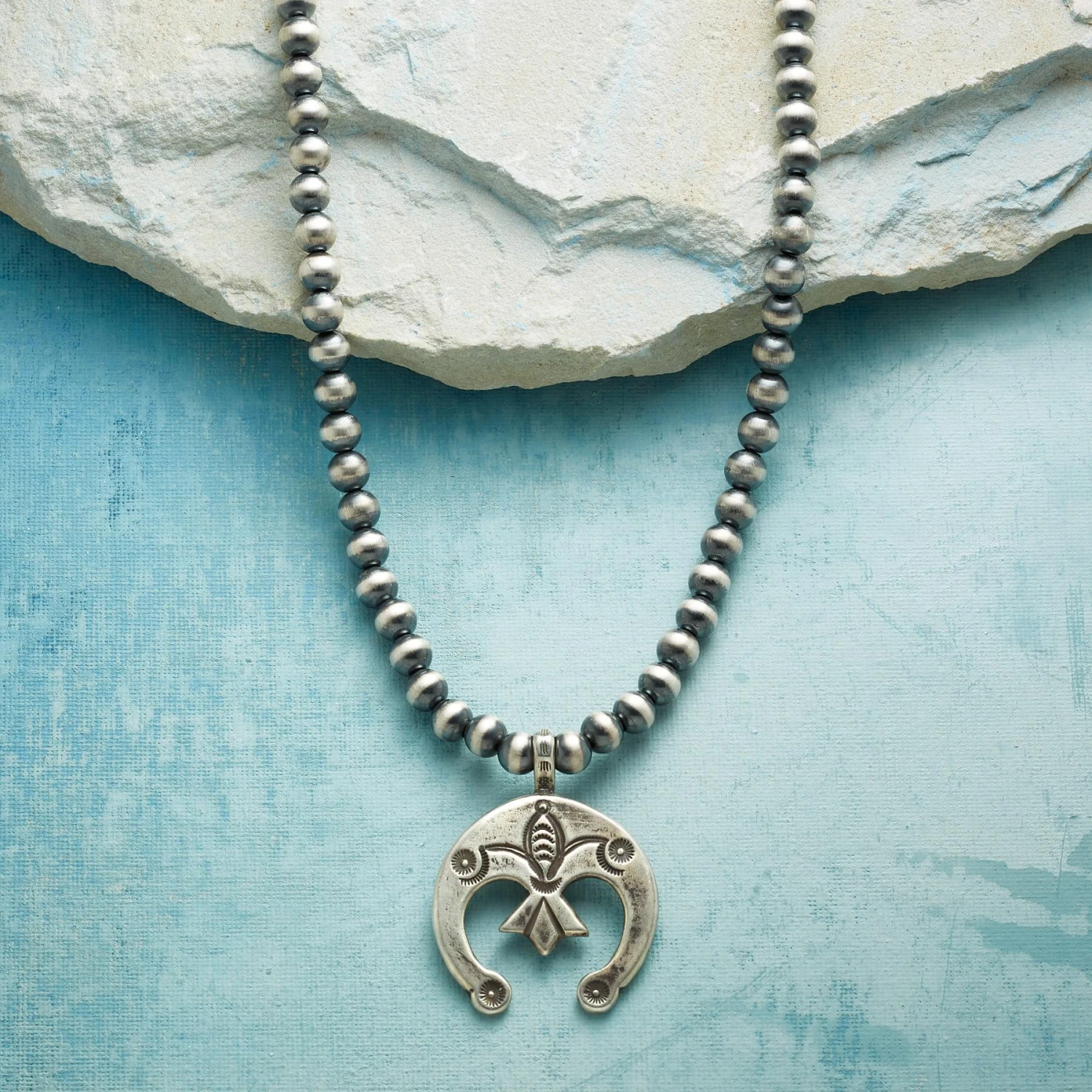 Cast from sterling silver by the Santa Fe silversmith Buffalo, this strong, simple naja graces a strand of sterling beads known as Navajo pearls. Linen thread wraps the back for comfort. Handmade in USA. Exclusive. Approx. 30″L; naja 2″L x 1-1/2″W.
