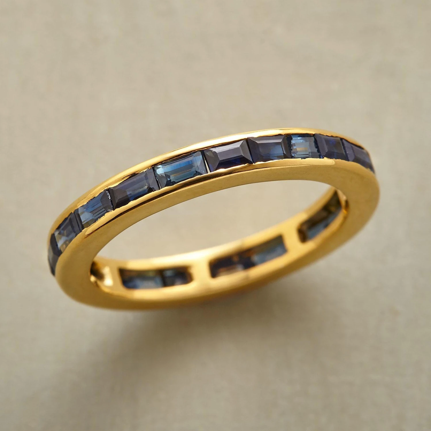 A sapphire eternity band ring, with alluring sapphires encircling the finger in an endless ring of blue. Ours exclusively, handcrafted in 14kt gold. Whole sizes 5 to 9.