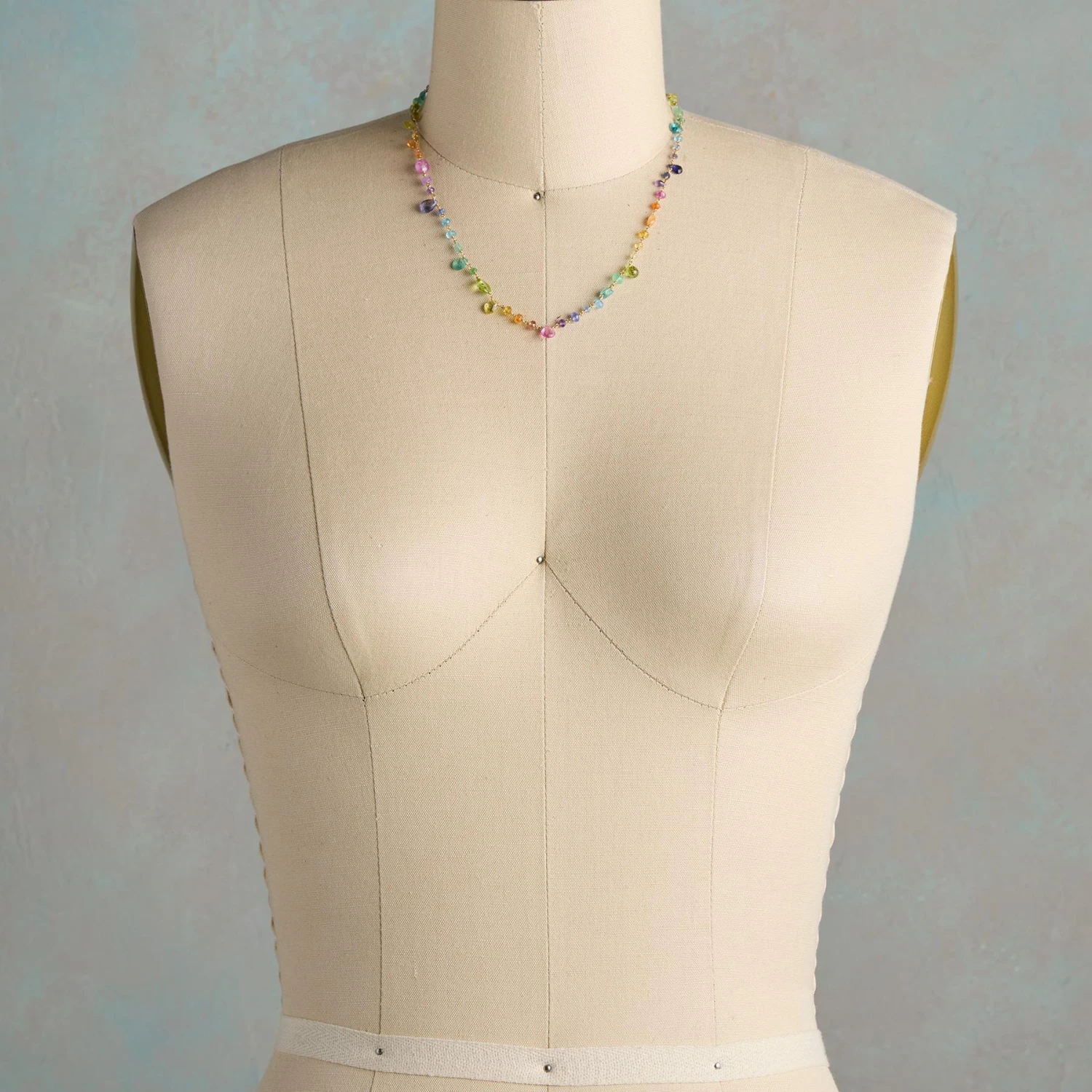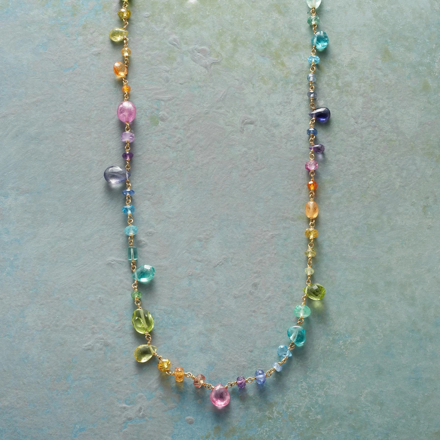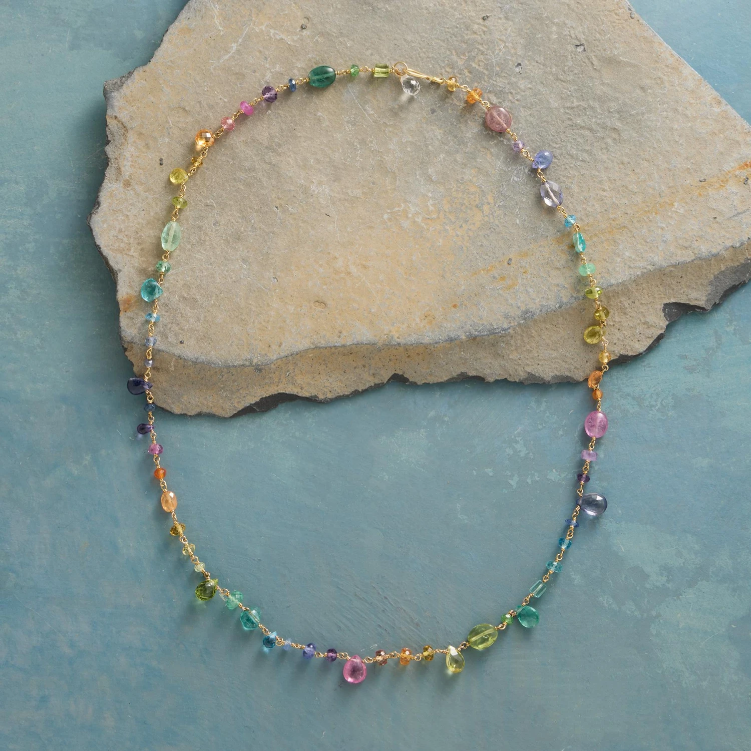 A painter’s palette of gemstones linked one to the next with 18kt gold. By Polly Hart with amethyst, iolite, sapphire and more. Hook clasp. Handmade in USA. 17″L.