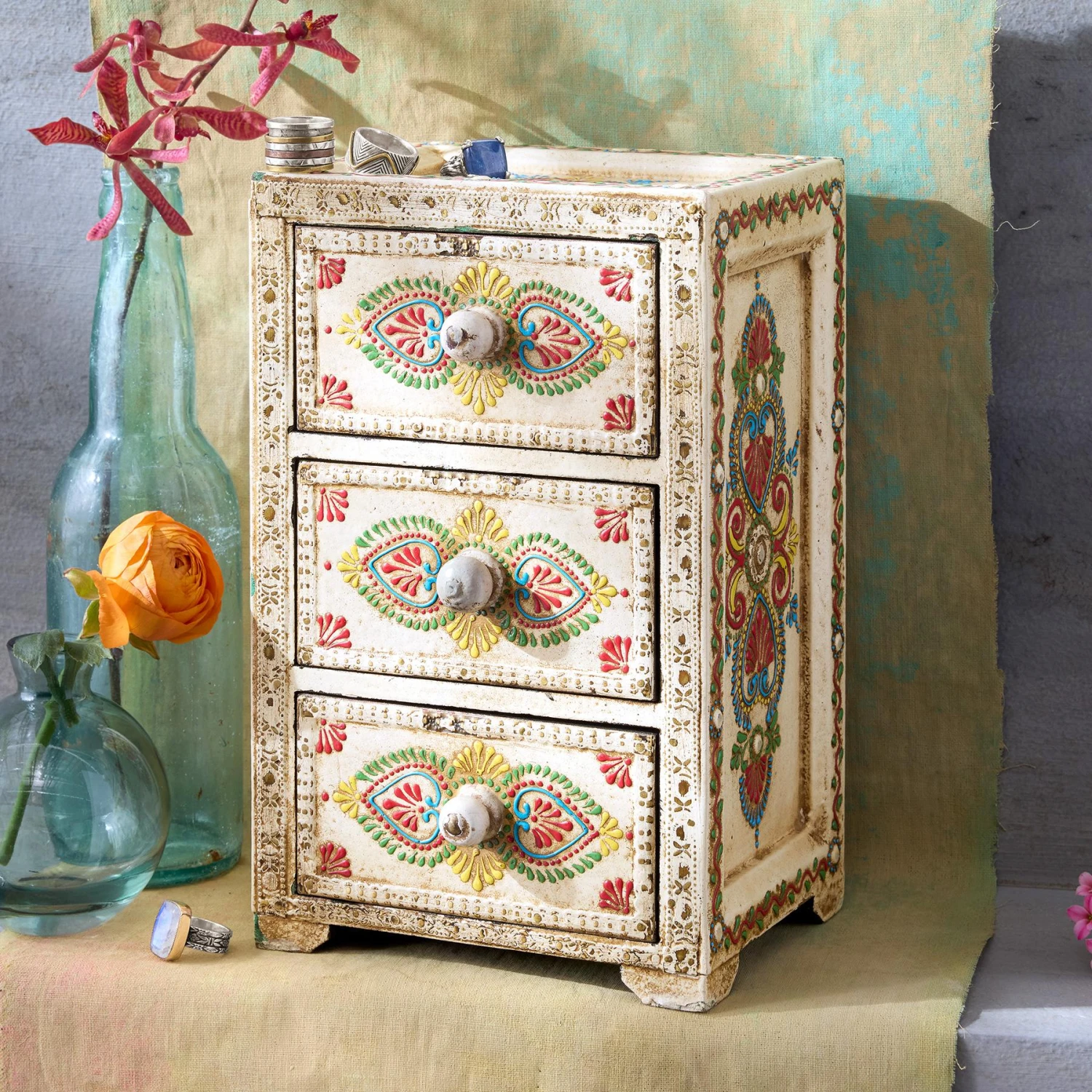 Hand painted with bright floral flourishes on weathered white, our wood bureau makes a charming home for jewelry, make-up and small treasures. Three drawers offer compact storage atop a dresser or vanity. Exclusive. Imported. 6″W x 9-1/2″H x 4-1/4″D.