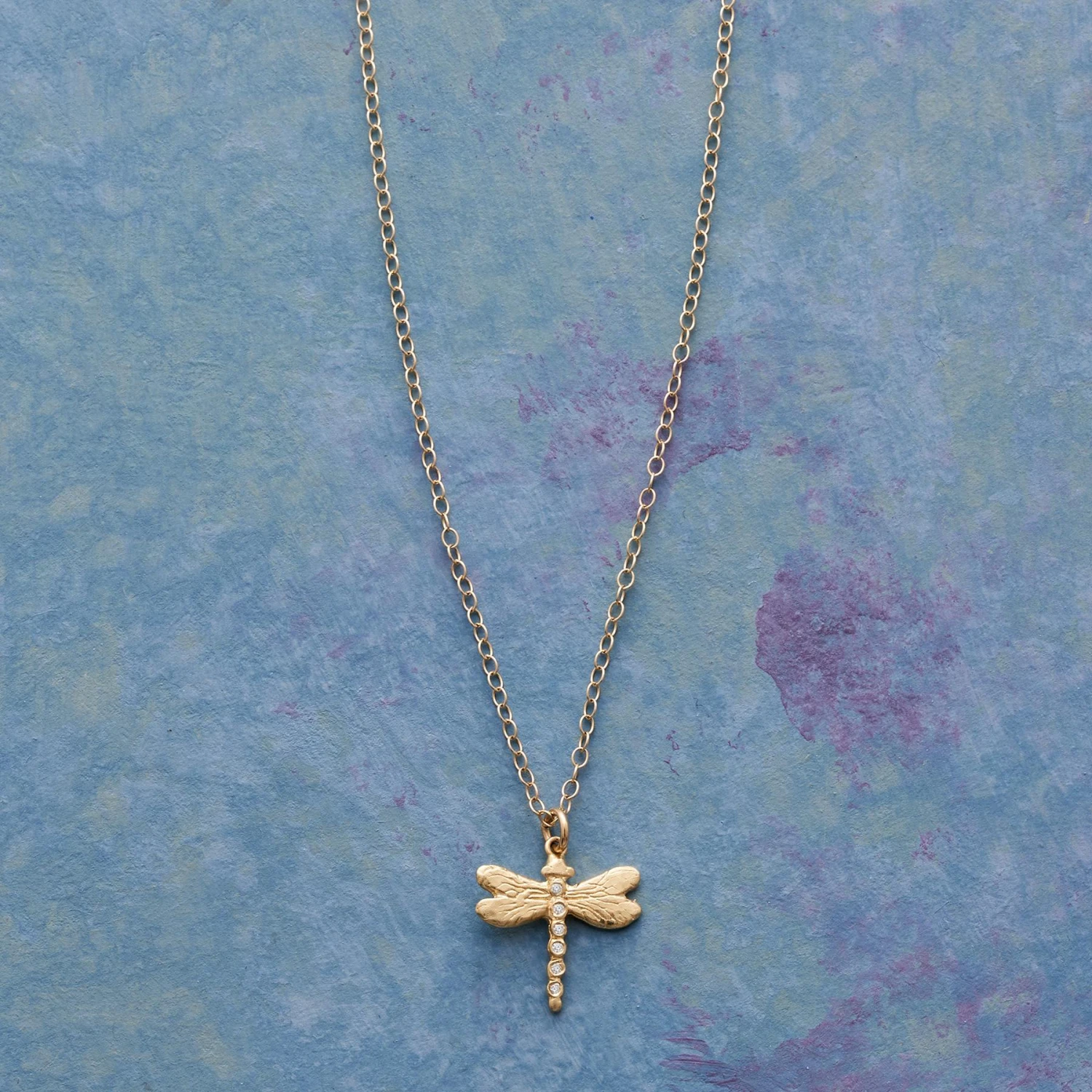Handmade by Victoria Cunningham, this 14kt gold necklace celebrates the power of transformation, light and joy with a diamond-kissed dragonfly forever in flight. 14kt gold spring ring clasp. Made in the USA. 16″L; 1/2″ drop.