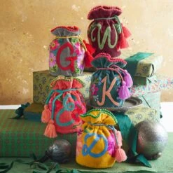A fitting home for favorite treasures, or a gift bag that’s a gift in itself, our drawstring pouch is sewn of soft cotton velvet embroidered with bright blooms and finished with a tasseled cord. Imported. 4-1/2″ dia. x 6″H.