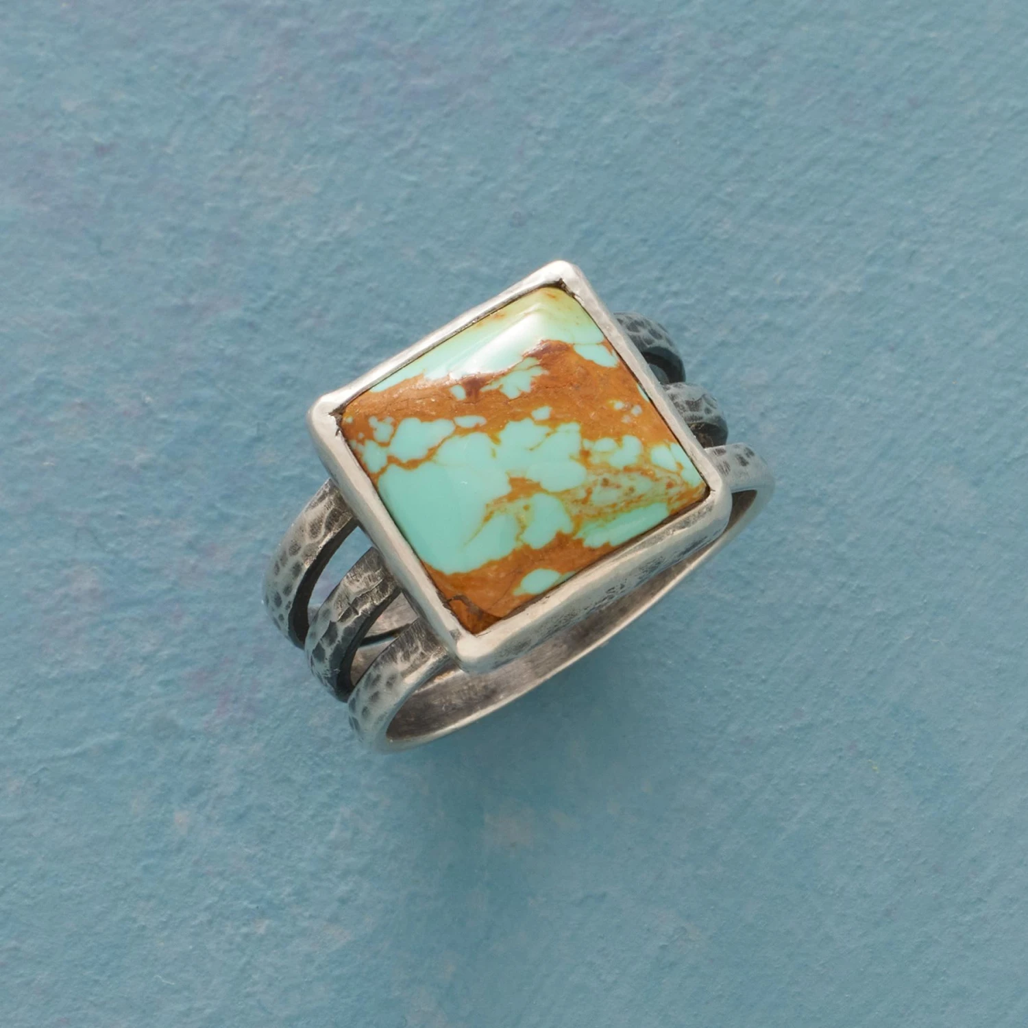 Hand cast and hammered, our split-shank sterling silver ring bears a lightly oxidized finish and a square of natural turquoise, each stone one-of-a-kind. Exclusive. Whole sizes 5 to 9. 5/18″ tapers to 1/4″.