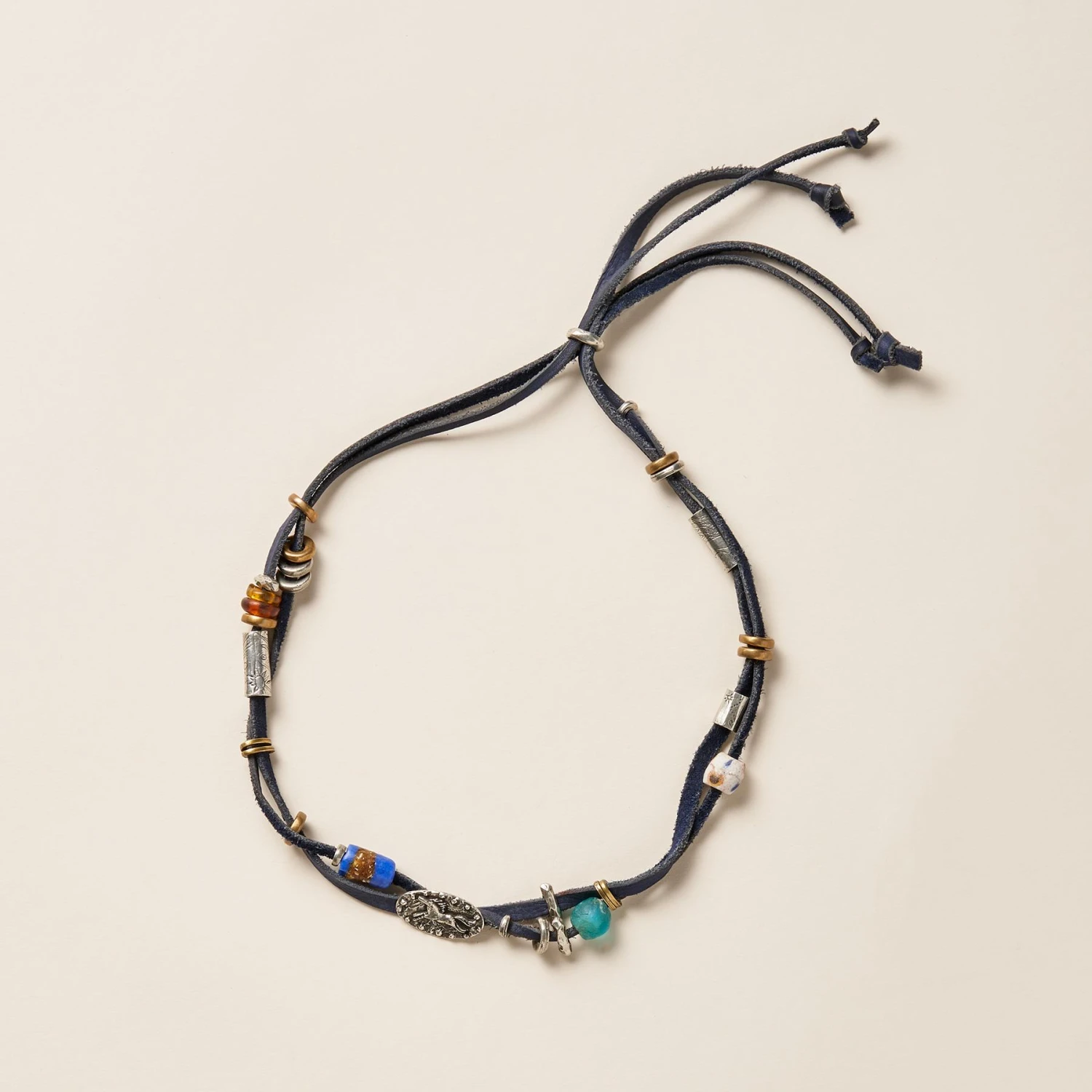 Trade beads from Jes MaHarry’s collection are threaded on blue leather, amid handcrafted brass-plated and pewter beads and her signature running horse charm. USA. Exclusive. Adjustable to 32″L. Hat sold separately.