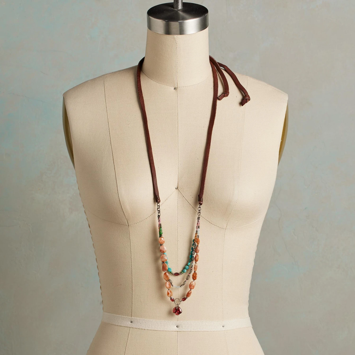 Turquoise and labradorite round a bend of autumnal garnets, painting a landscape in three tiers of stone. Accented with blue topaz, amazonite, mystic pink sapphire, sunstone and hand-stamped Thai silver. Leather laces adjust with a slider knot. Handcrafted in USA. Exclusive. Adjustable to 40″L.