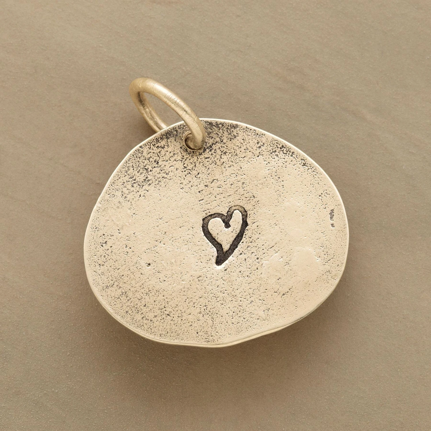 Jes MaHarry’s 14kt gold charm is engraved with date and one initial; stamped heart on reverse. 1″L.