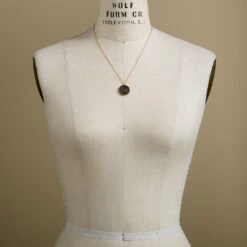 This zodiac constellation necklace is handcast in matte 24kt gold plate, with a gunmetal face showing each sign’s constellation in faceted white topaz, the sign stamped on the back. 24kt gold plate chain with spring ring clasp. 18″L; 7/8″ dia.