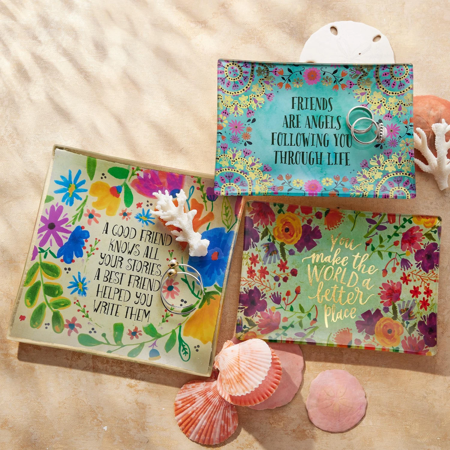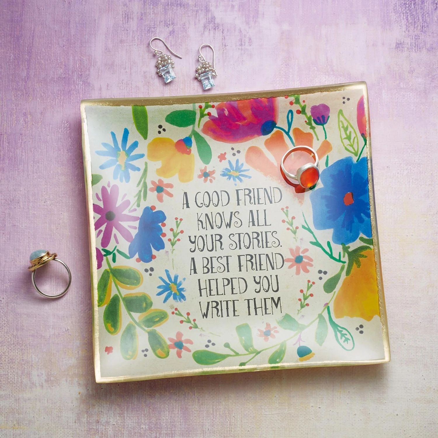 Every good friendship has a story, every true friend helped you write yours; give a gift of love to your true friend with this painted glass dish beautifully detailed with gold foil. Approx. 6″ sq.