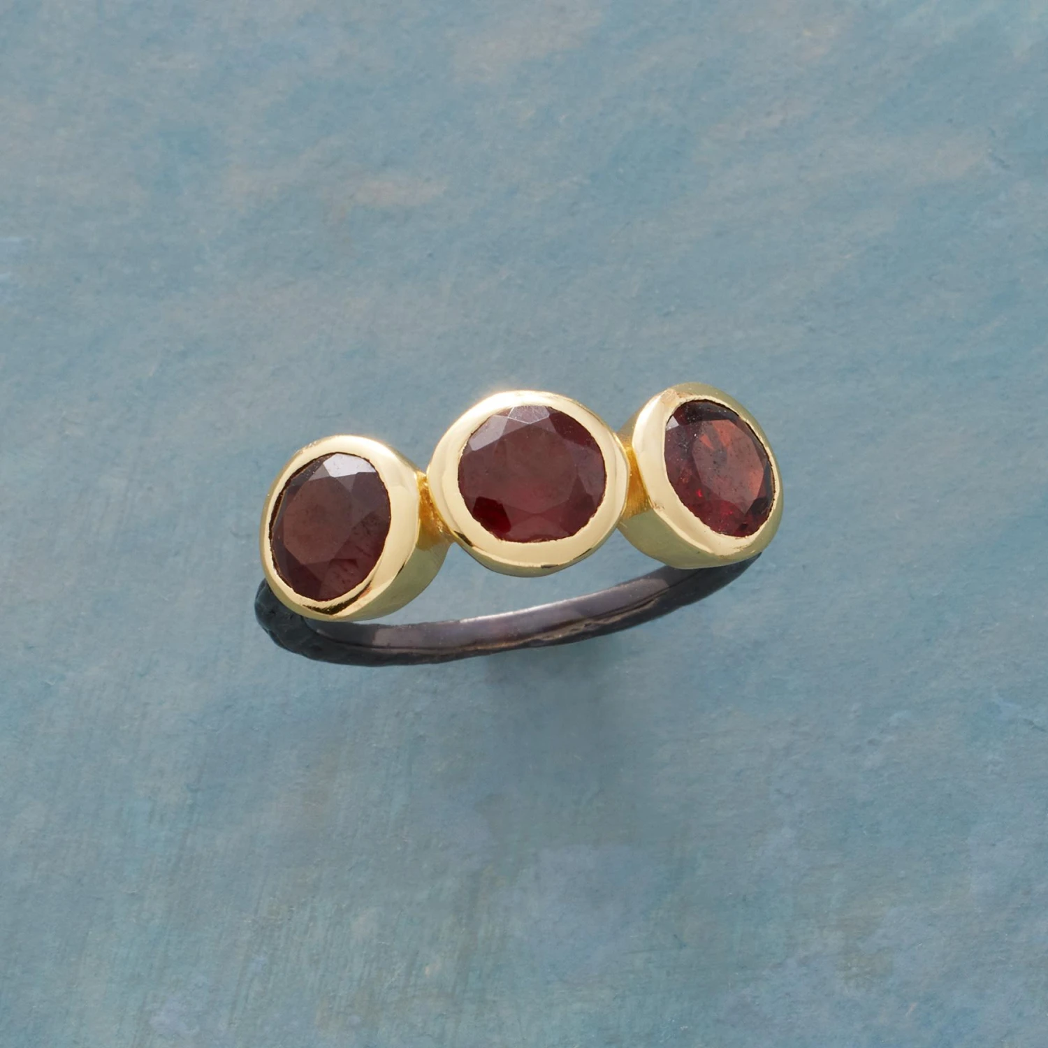 A garnet trio set in 14kt gold vermeil blazes atop a distinctive black ruthenium-plated band. Handmade. Exclusive. Whole sizes 5 to 9.