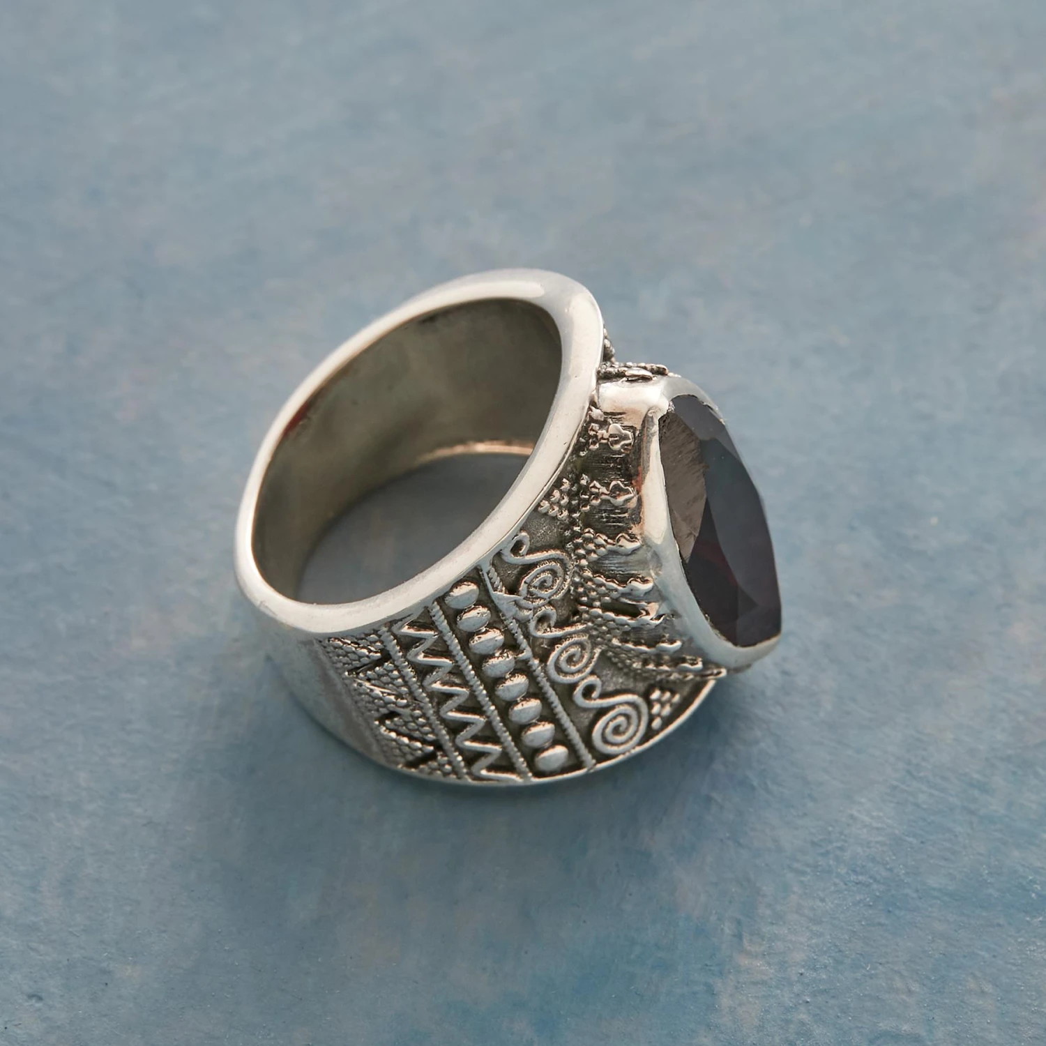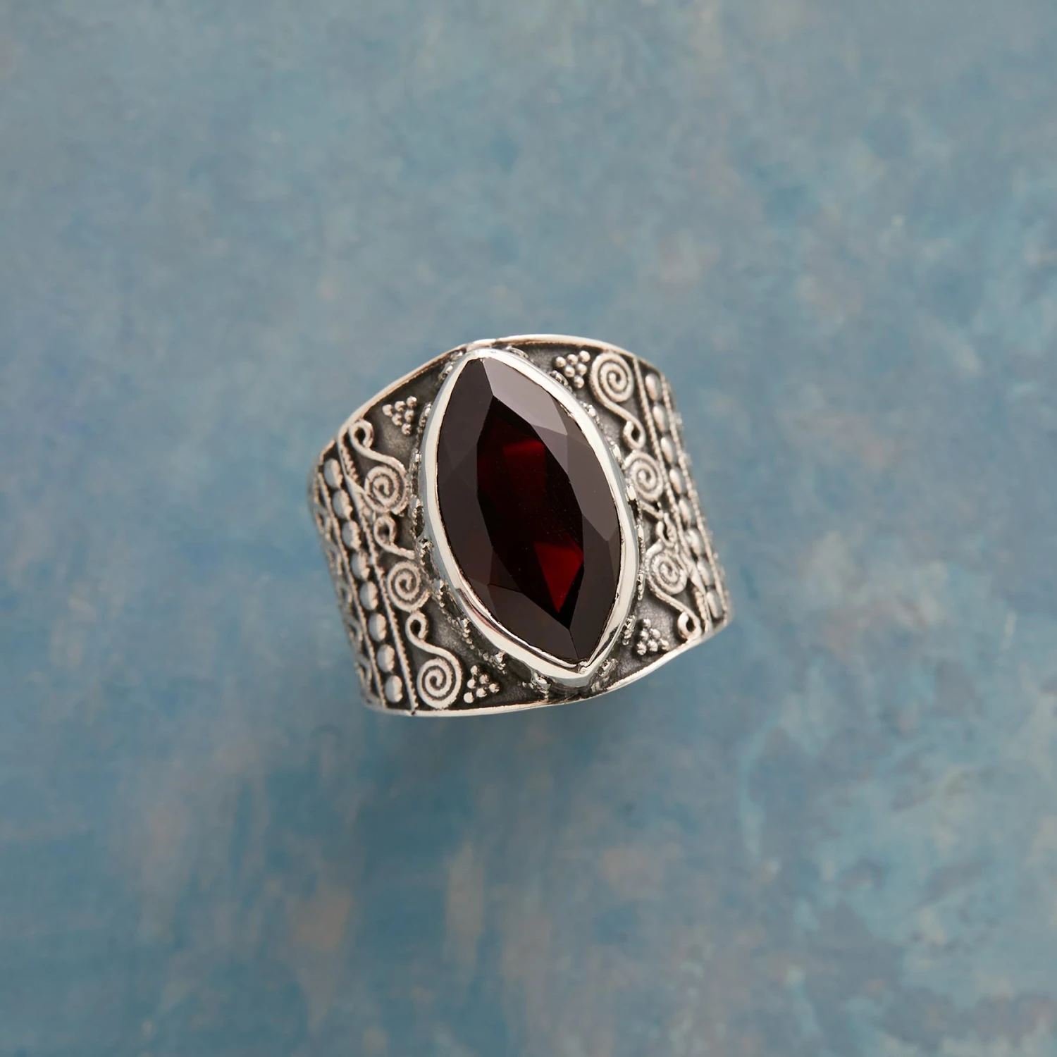 Garnet gets its Gothic edge from a dramatic marquise cut, coloration and ornately adorned band. Oxidized sterling silver. Exclusive. Whole sizes 5 to 9. 3/4″ tapers to 1/4″W.