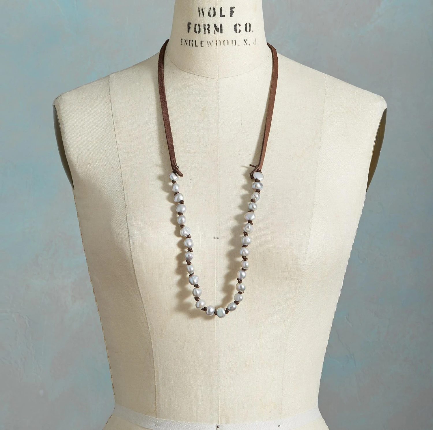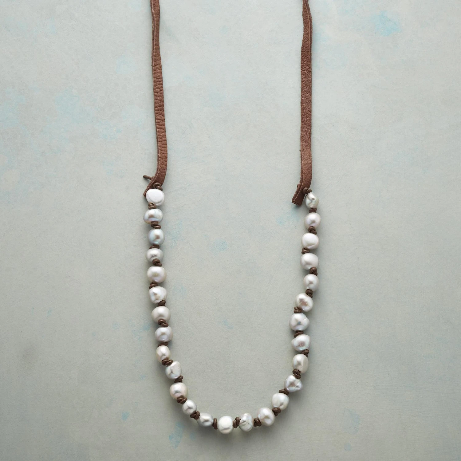Super pearlescent, naturally gray cultured pearls to tie short or long, or even wrap round the wrist. Leather knotting; suede ties. Handcrafted in USA. 36″L.