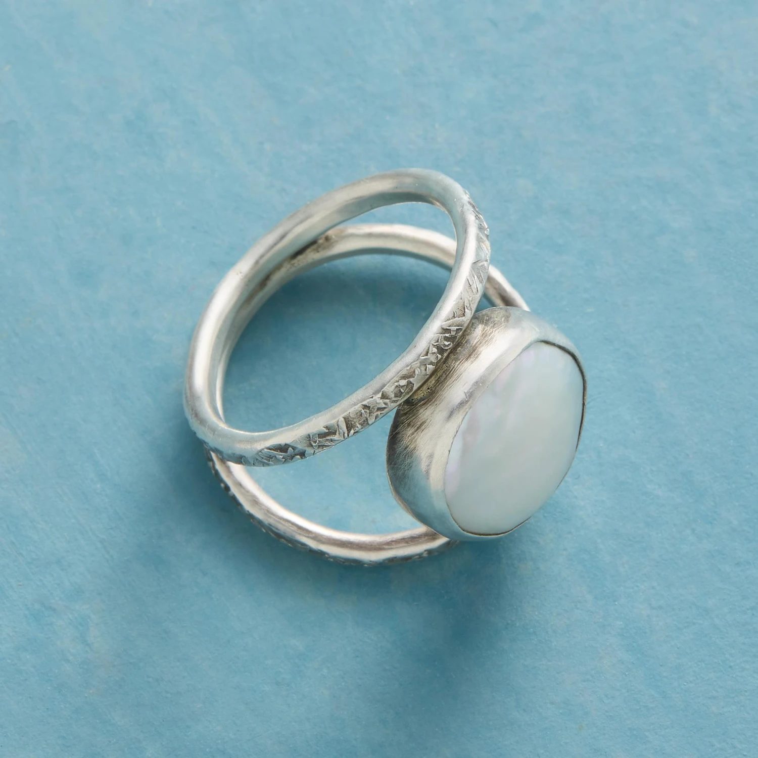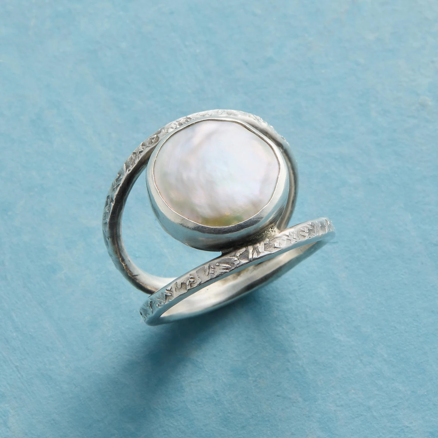 A freshwater cultured coin pearl spans the gap between two textured, oxidized sterling silver bands – a design that’s ethereal yet edgy, bold yet not bulky. Handcrafted in USA. Exclusive. Whole sizes 5 to 9. 5/8″ tapers to 1/8″W.