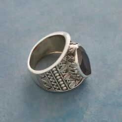 Expertly inlaid in sterling silver, tiles of Kingman turquoise form a brilliant patchwork between columns of cabochons and silver balls. Accented with rope-twists and a tapering quadruple-shank band, this dramatic ring is testimony to the skills of its makers, Benny and Valerie Aldrich. Natural variations in the stone make each ring one of a kind. USA. Exclusive. Whole sizes 5 to 9. Band 3/8″ tapers to 1/8″, 1-1/4 setting.