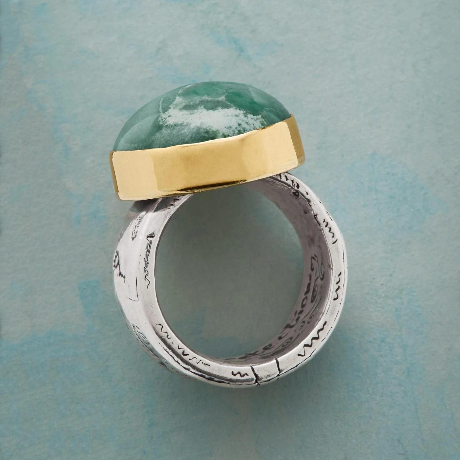 Crowned with a dome of rare Kingman turquoise, each stone one-of-a-kind, this hand-etched sterling silver ring by Jes MaHarry bears the words “love” and “protection” inside the band. 14kt yellow gold bezel. USA. Exclusive. Whole sizes 5–9.
