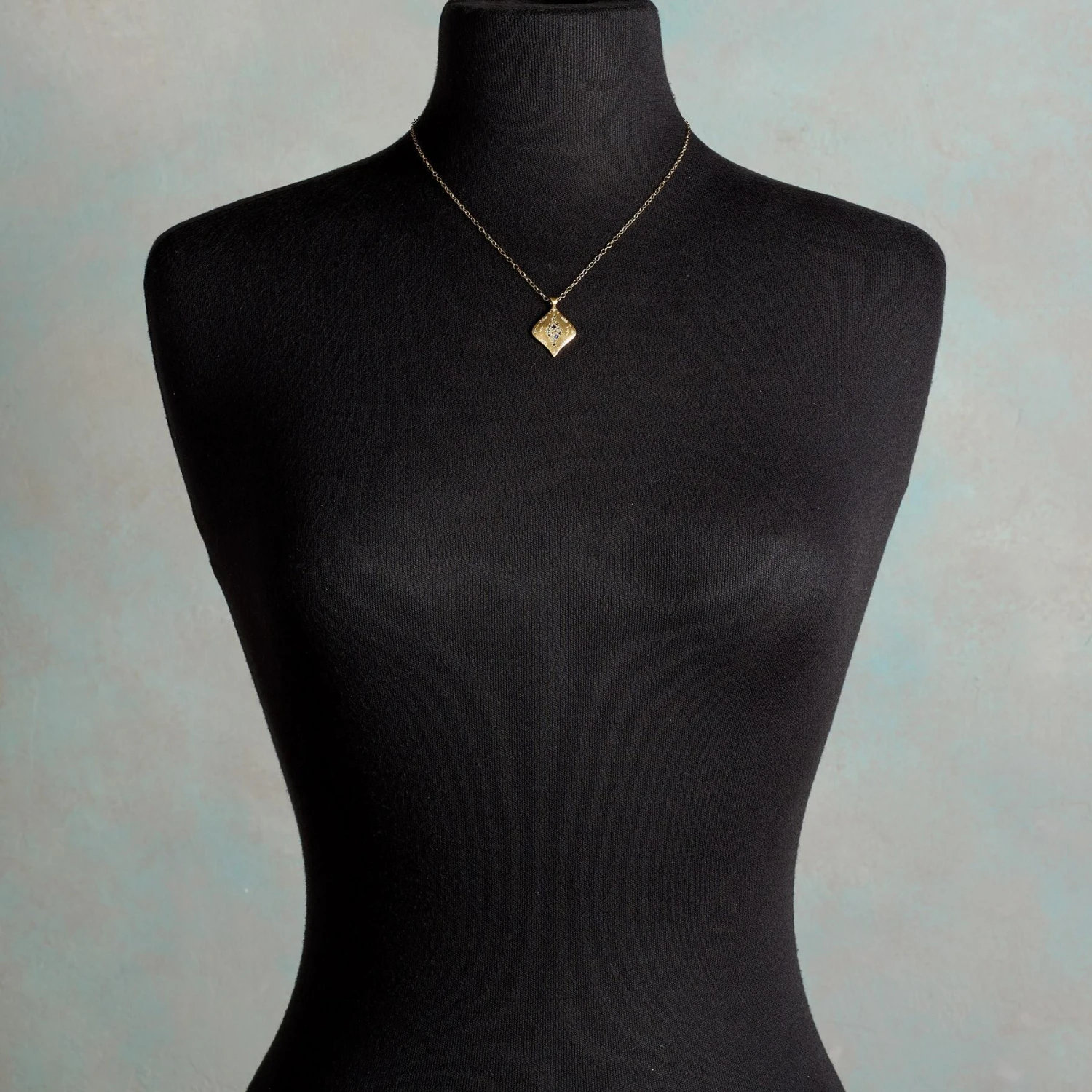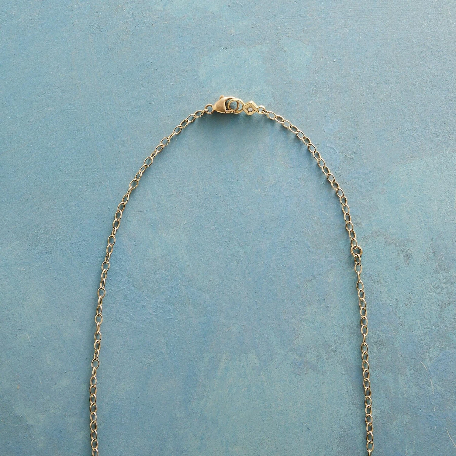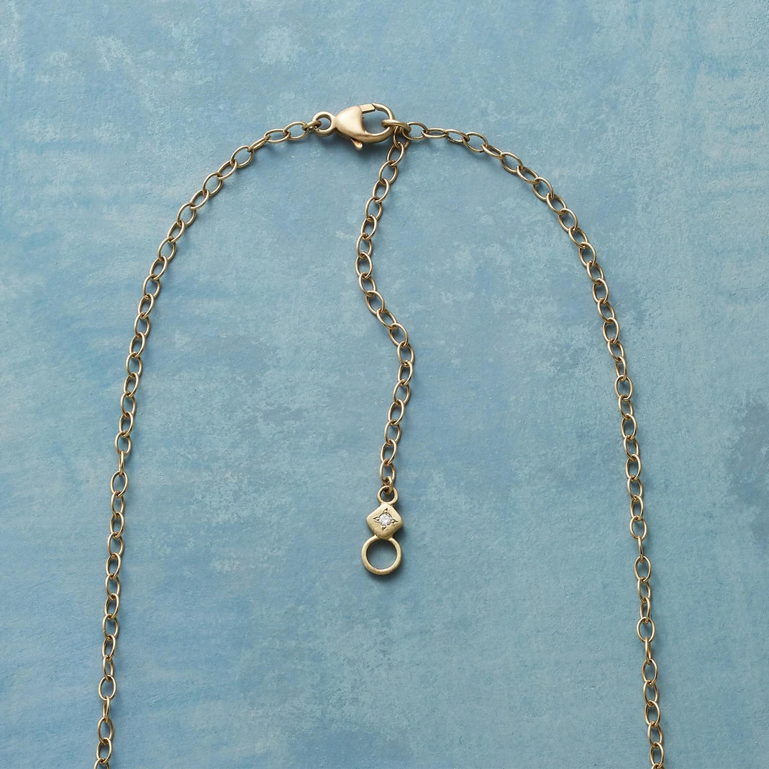 Within a glittering diamond border, Adel Chefridi composes a rhapsody in blue with sapphire and aquamarine gemstones. 18kt gold. Lobster clasp. Handmade in USA. 16″ to 18″l. Pendant 1″l x 3/4″w.