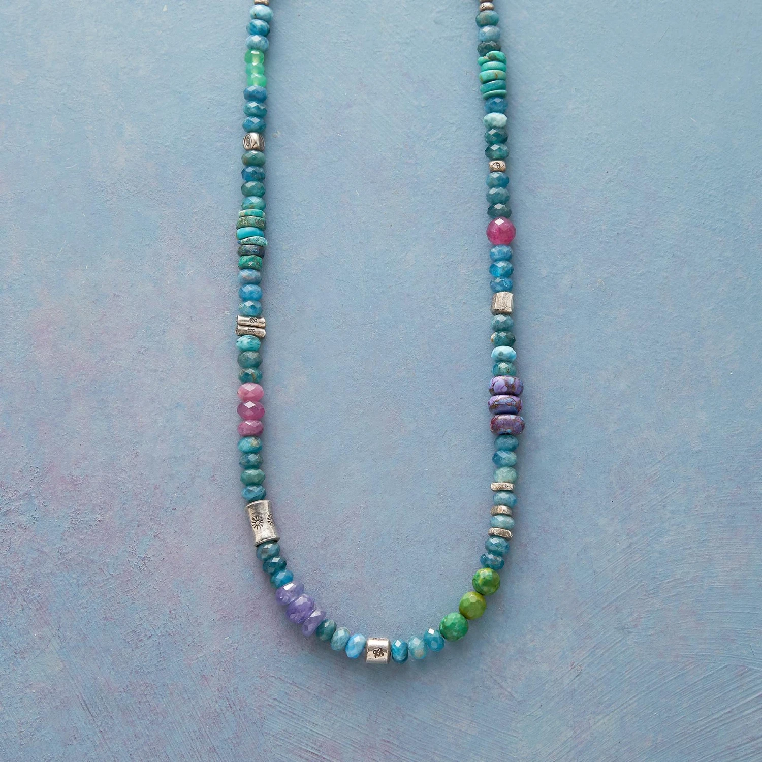 Gems from around the world flow effortlessly in a river of color. Handcrafted in USA with turquoise, pink tourmaline, tinted Czech crystal and more. Thai and sterling silver. Lobster clasp. Exclusive. 16″-17-1/2″l.