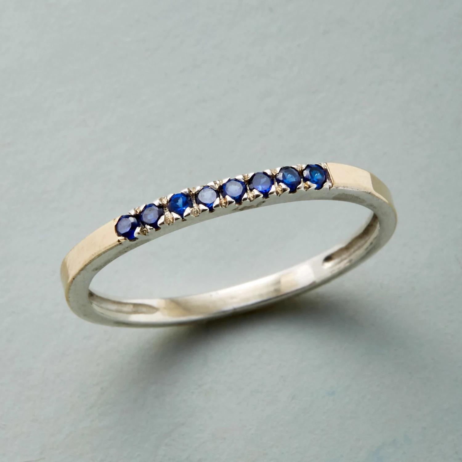 A stream of sapphire runs through a slender, stackable sterling silver ring, overlaid with 14kt gold. Exclusive. Whole sizes 5–9.