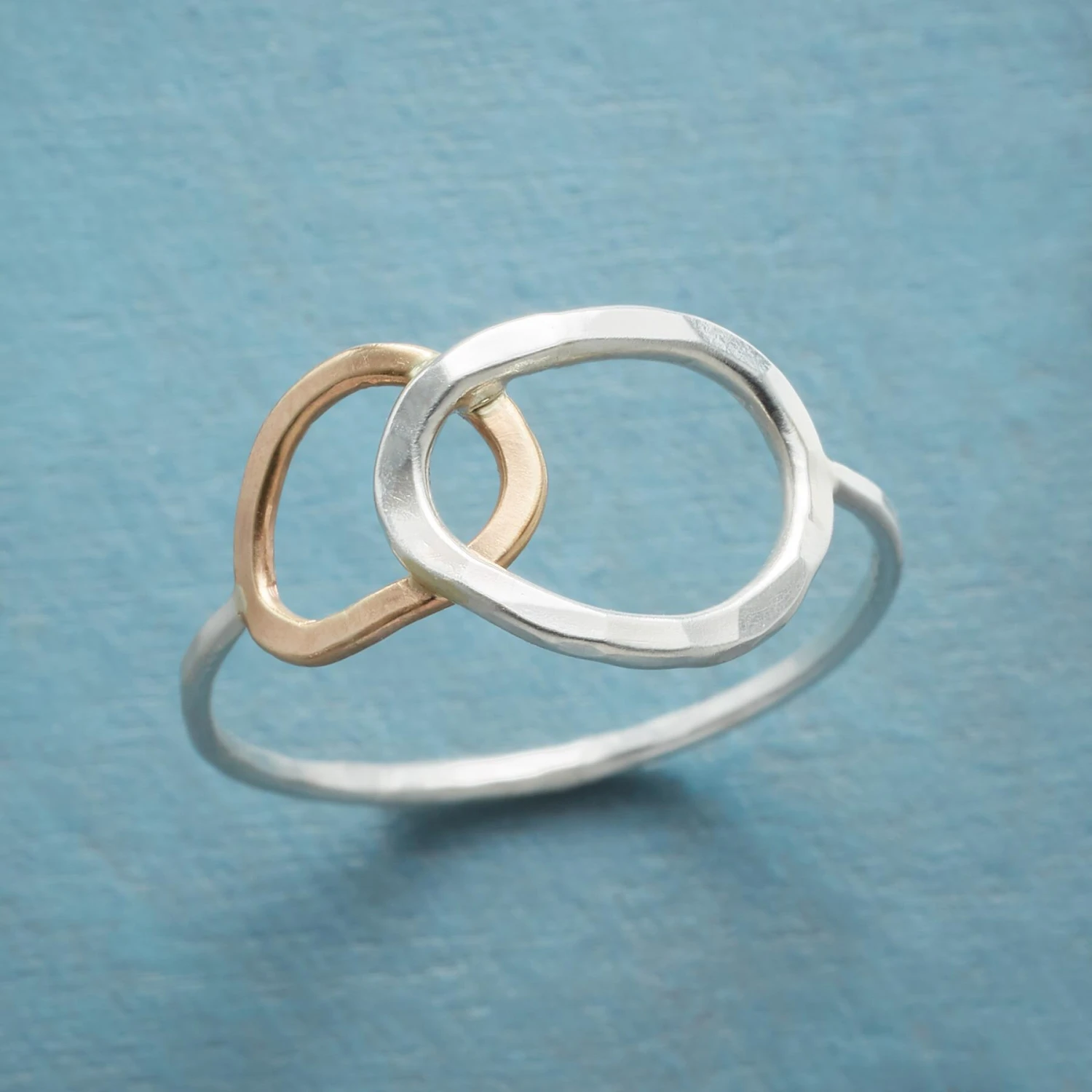 Organic circles of sterling silver and 14kt gold filled echo and overlap in this simple, sculptural ring. Sterling band. Handcrafted in USA. Exclusive. Whole sizes 5 to 9.