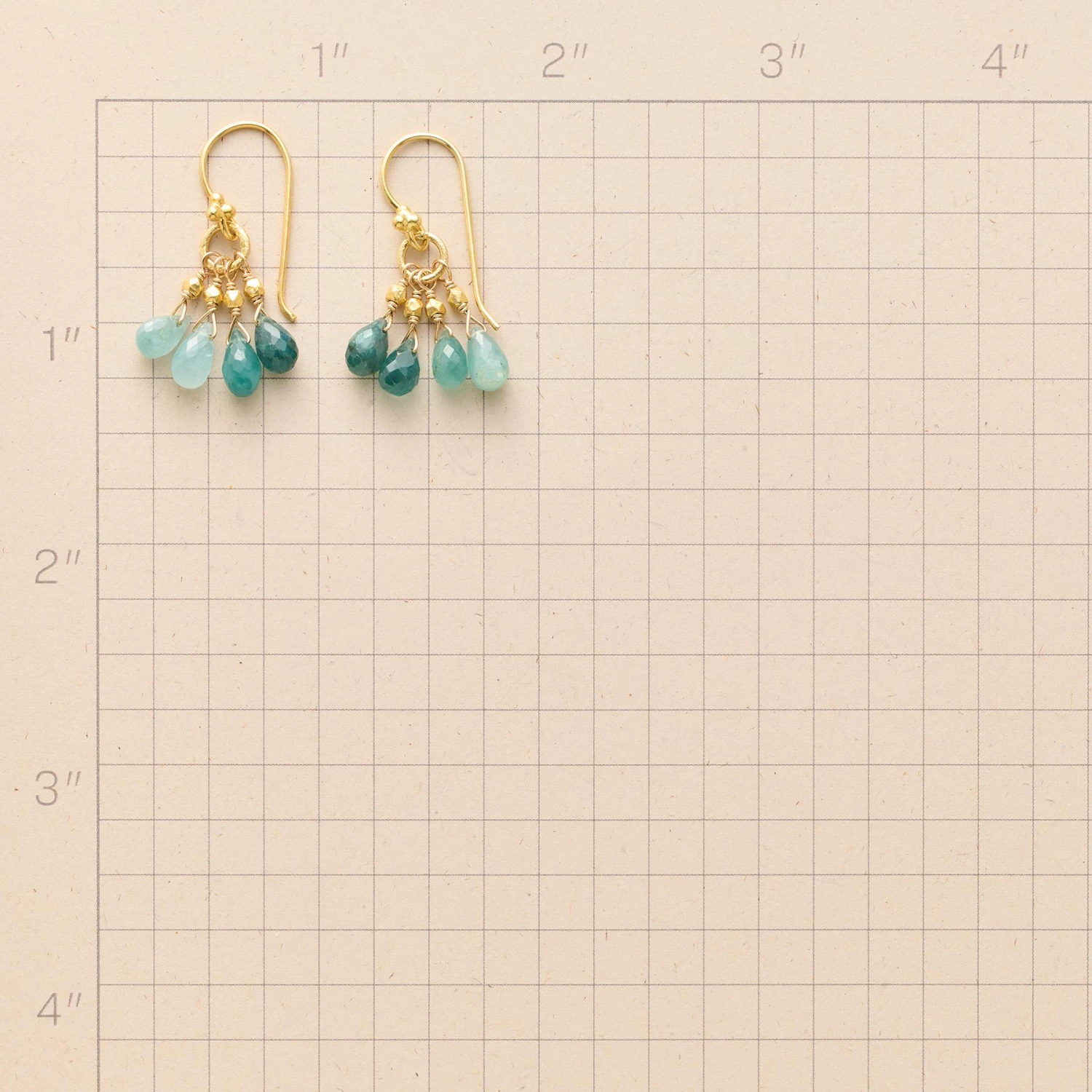 Four dangling briolettes offer a sampling of grandidierite’s varied hues, a glimpse of tropical seas. Handcrafted in USA with 18kt gold vermeil. French wires. 1-1/4″L.