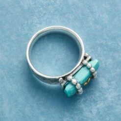 A handcrafted sterling silver ring holding a precious parcel of turquoise wrapped in sterling beading and bearing a brass heart. Exclusive. Whole sizes 5 to 9.