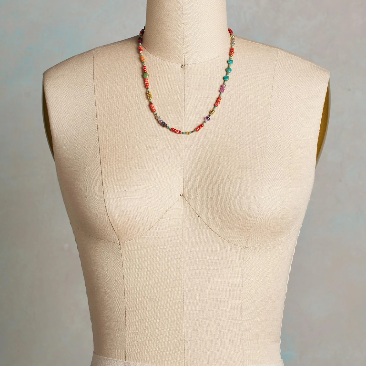 Traditional turquoise and spiny oyster join amethyst, sapphire, ruby, 22 kt gold-plated Thai silver and copper-wrapped stabilized turquoise in a spirited mix that feels both familiar and fresh. Sterling silver lobster clasp. Handcrafted in USA. 18″ to 19-1/2″l.