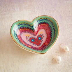 Give the gift of enduring love and friendship with this sweet heart-shaped treasure holder. Perfect for rings, trinkets and all that is dear. Glazed terra cotta. Imported. 3″W x 3-1/4″D x 3/4″H.