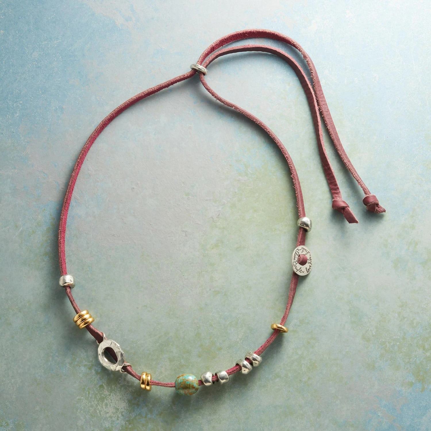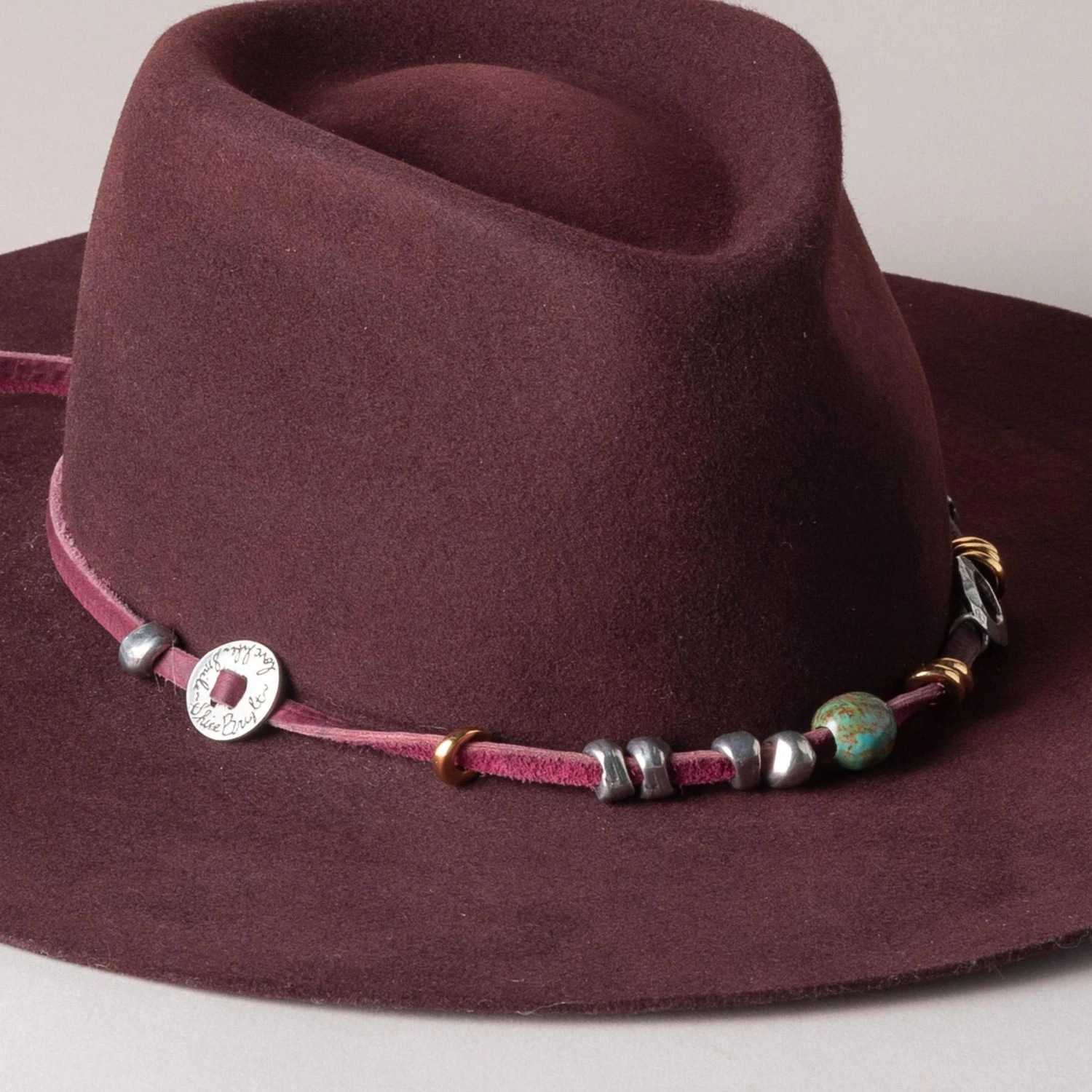 Along a strand of plum-colored leather, vibrant turquoise nestles among pewter and brass-plated beads and two pewter charms by Jes MaHarry. A pewter slider lets it adjust to hug the crown of your hat. Made in USA. Exclusive. One size/Adjustable. Hat sold separately.