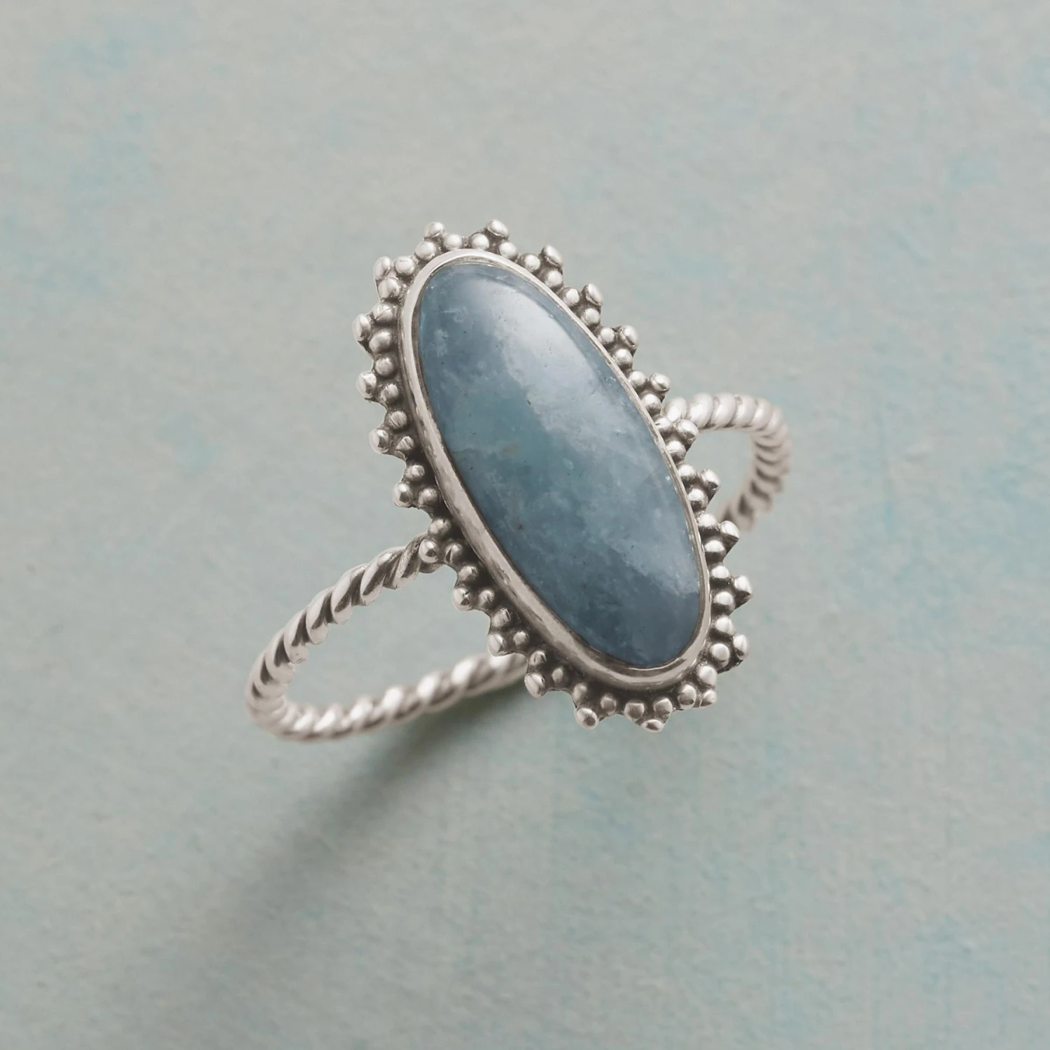 Milky aquamarine, surrounded by delicate sterling beading and set on a roped sterling silver band, swirls in the shade of the sea. Exclusive. Whole sizes 5-9.