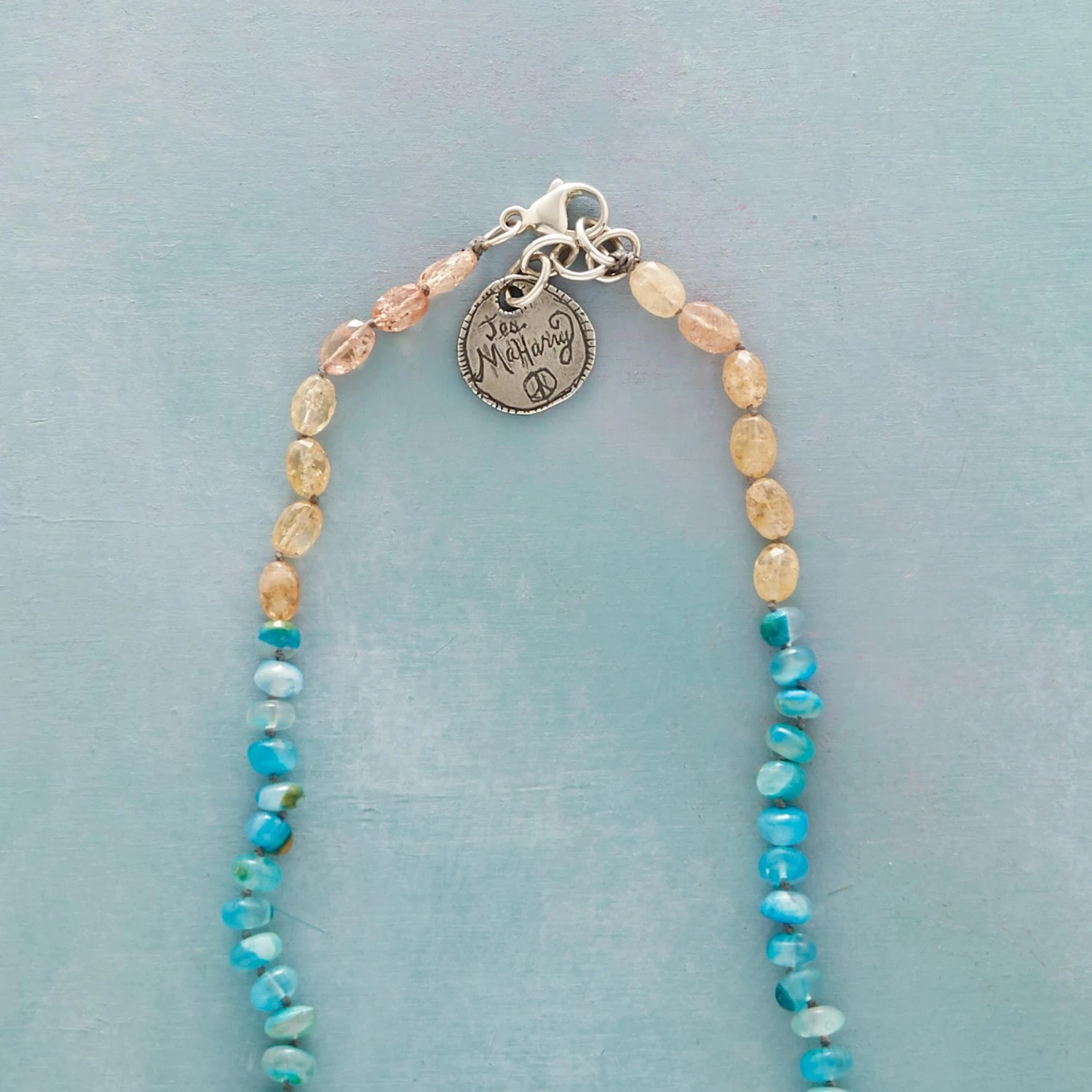 Peruvian opal and imperial topaz conjure the heavens in which Jes MaHarry’s crescent moon shines. Handcrafted of sterling silver, with birds and beasts on the front and “Love Beyond the Moon” on the back. Sterling lobster clasp. USA. Exclusive. 21-1/2″ to 22-1/2″L, 1-3/4″ dia.