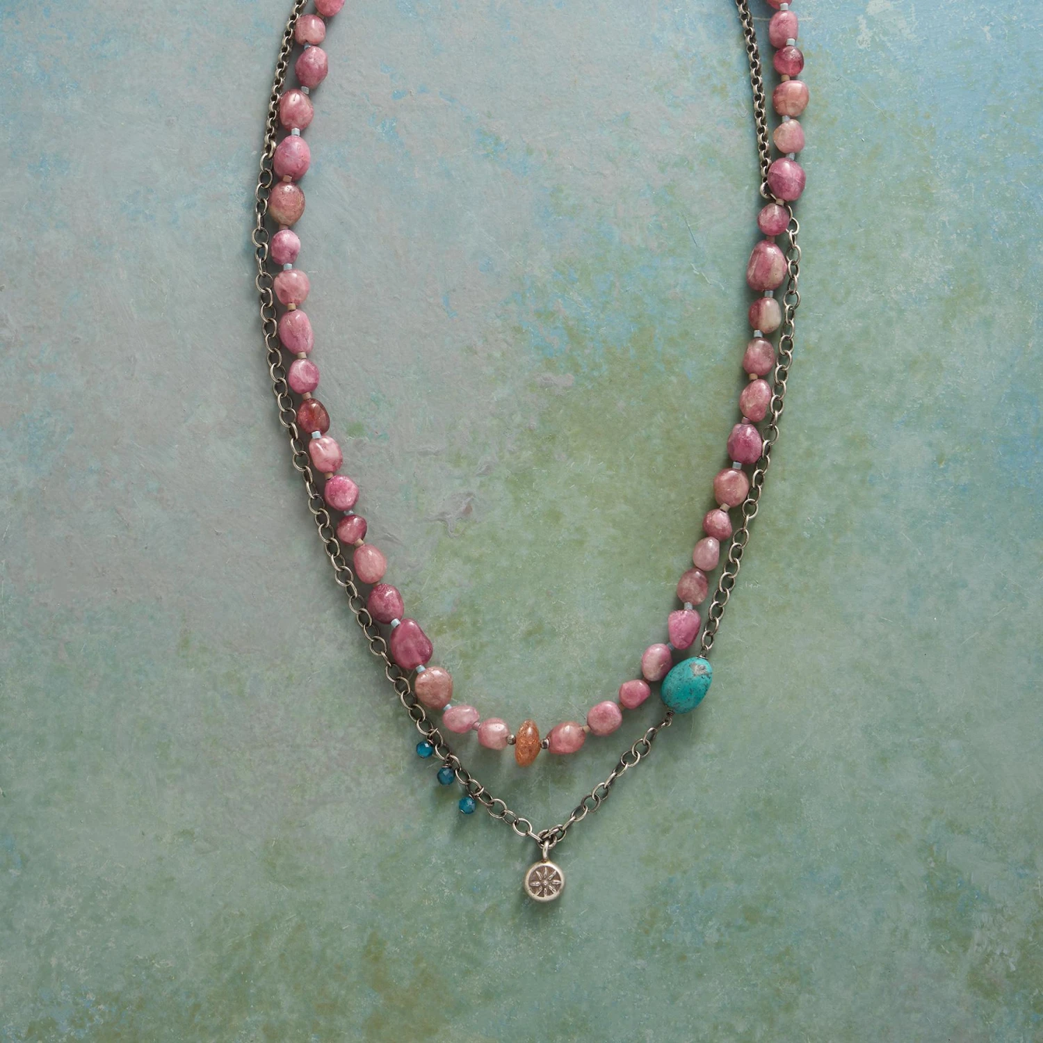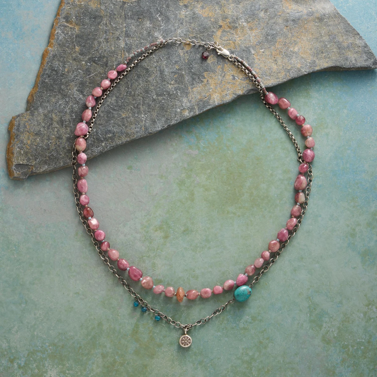 One strand of pink tourmaline and Miyuki glass beads hangs alongside sterling silver links with a smattering of stones and a Thai silver charm. Exclusive. Handmade in USA. 18″ to 19-1/2″L.